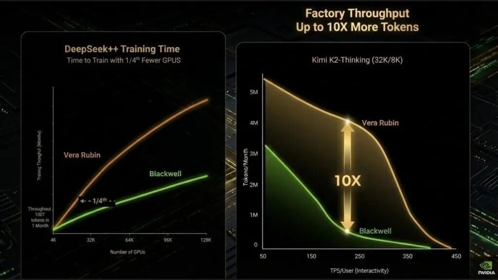 训练图表显示了下一代超大型模型的训练时间(以月计)。结论令人大开眼界。Rubin平台使用大约四分之一的GPU达到与Blackwell相同的训练吞吐量。正如我们之前指出的,这不仅仅是关于更快的芯片。它反映了规模上效率的巨大提升——减少同步开销、更少的内存停顿、更低的结构争用以及更短的训练周期。