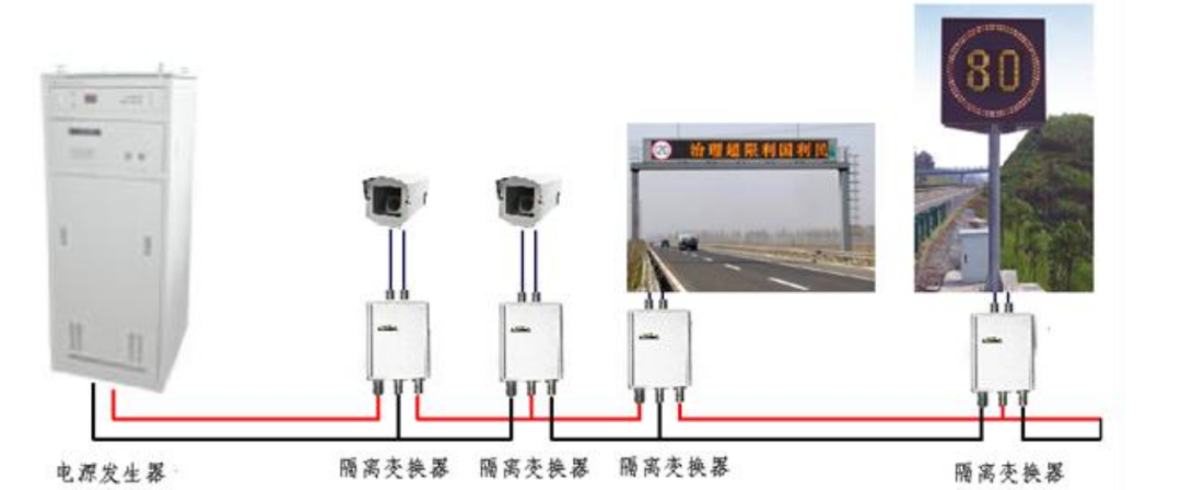 安装在局端的设备将交流电转换为直流电并做升压处理,高压直流电通过电缆传输到远端接收设备之后转换成相应的直流电或交流电,再向外场监控设备进行供电。