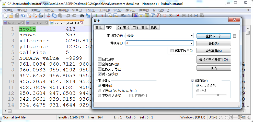 使用notepad++软件打开“asc.TXT”文本,使用【替换】工具,将值“-9999”替换为“3”,点击【全部替换】,然后【保存】。注:直接使用记事本自带的替换工具可以快速地进行NoData值的替换,NoData值默认为“-9999”,但是第六行NoData参数必须设置为“-9999”。