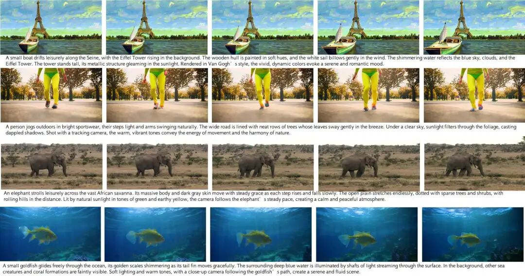 定性结果(图 4 和补充材料)进一步证实了定量改进。VideoAR 始终如一地生成视觉上引人注目且语义连贯的视频,涵盖富有想象力的艺术风格化、高保真自然场景以及具有强时间一致性的动态人类动作。