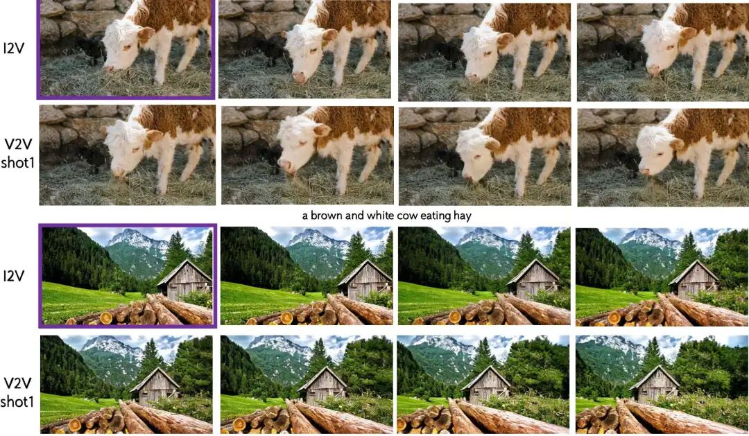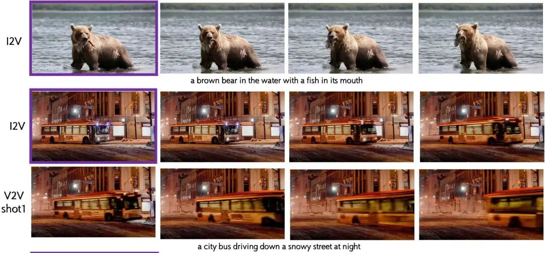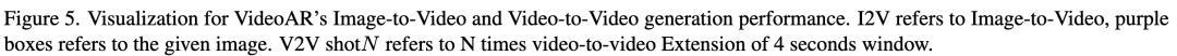 图生视频与视频续写作为一种自回归视频生成模型,本工作提出的 VideoAR 可以直接从前面的内容(包括初始图像和序列帧)扩展未来的帧,而无需外部微调。为了进行评估,本工作从 VBench-I2V 中采样了几个测试用例。本工作展示了多个图生视频 (I2V) 和视频到视频 (V2V) 的示例,其中 VideoAR 实现了单镜头或多镜头连续视频生成。如图 5 所示,VideoAR-4B 在各种设置下准确遵循与输入图像对齐的语义提示,包括对象运动控制和相机轨迹调整。对于视频连续性任务,VideoAR 可以在多次迭代中生成自然且一致的内容,最终生成持续时间超过 20 秒的长视频。