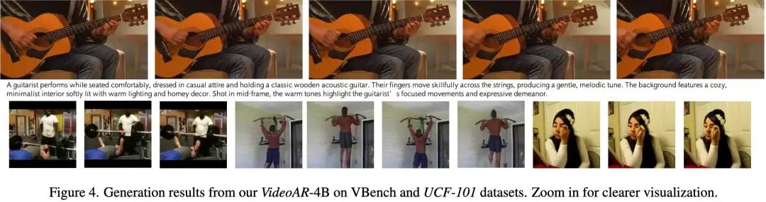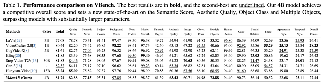 真实世界视频生成为了进一步验证本方法的有效性和可扩展性,本工作在具有挑战性的真实世界视频生成任务上预训练了一个 4B 参数的 VideoAR 模型。如表 1 所示,本模型获得了 81.74 的总体 VBench 分数,实现了与当前规模大得多的最先进模型(如 30B 的 Step-Video-T2V 和 13B 的 Hunyuan-Video)相当甚至更好的性能。