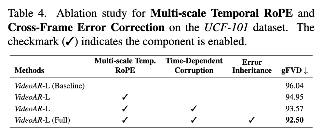 时间一致性增强的影响 (Effect of Temporal-Consistency Enhancement)接下来,本工作评估了提出的跨帧误差修正机制,该机制由两个协同组件组成。(1) 本工作首先激活时间依赖性破坏 (Time-dependent Corruption),这是一种在训练期间模拟推理时条件的数据增强策略。这一添加进一步将 FVD 降低到 93.57。(2) 在此基础上,本工作结合了误差继承初始化 (Error Inheritance Initialization),它鼓励模型修正继承的扰动以改进未来的预测。这最后一步产生了本工作的完整模型,实现了 92.50 的 SOTA FVD。