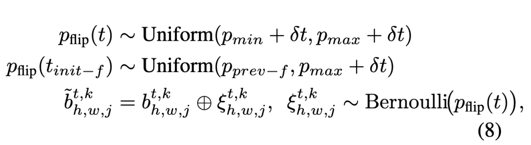 其中 表示异或, 表示增加翻转范围的因子。模型以被破坏的历史为条件,并由带有重新量化误差的自校正目标进行监督,从而提高了对复合错误的鲁棒性。