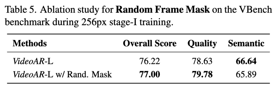 随机帧掩码 (Random Frame Mask) 的进一步消融是在本工作的大规模真实世界数据集上进行的,因为对小数据集 UCF-101 进行强增强可能会阻碍模型收敛。如表 5 所示,在 256px 训练阶段结合此技术将整体 VBench 分数从 76.22 提高到 77.00。
