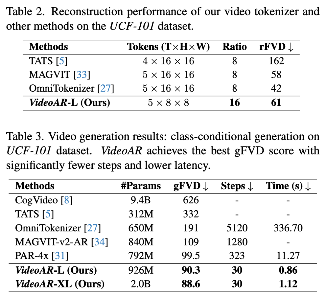 UCF-101 上的视频生成本工作的 VideoAR 框架在 UCF-101 数据集上建立了新的技术水平(State-of-the-Art),标志着在实现卓越生成质量和前所未有的推理效率方面的范式转变。如表 3 所示,本工作的 20 亿参数模型 VideoAR-XL 实现了新的最佳 ,超过了之前领先的自回归模型 PAR-4x()达 11%。即使是本工作较小的 926M 模型 VideoAR-L,也以 90.3 的 FVD 优于它。然而,最显著的进步在于推理速度:仅需 30 个解码步骤(减少了超过 10 倍),VideoAR-L 仅需 0.86 秒即可生成视频,实现了比 PAR-4x 快 13 倍以上的推理速度。
