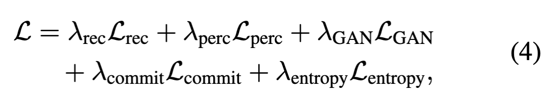 分词器通过一组标准的互补目标函数进行训练。本工作在每一帧上应用重构损失、感知损失和承诺损失 (commitment loss)。遵循 [33],本工作使用 LeCAM 正则化以提高稳定性,并使用熵惩罚以鼓励码本的利用率。