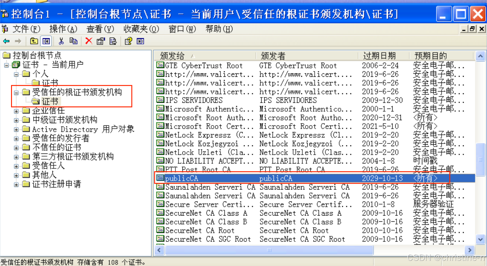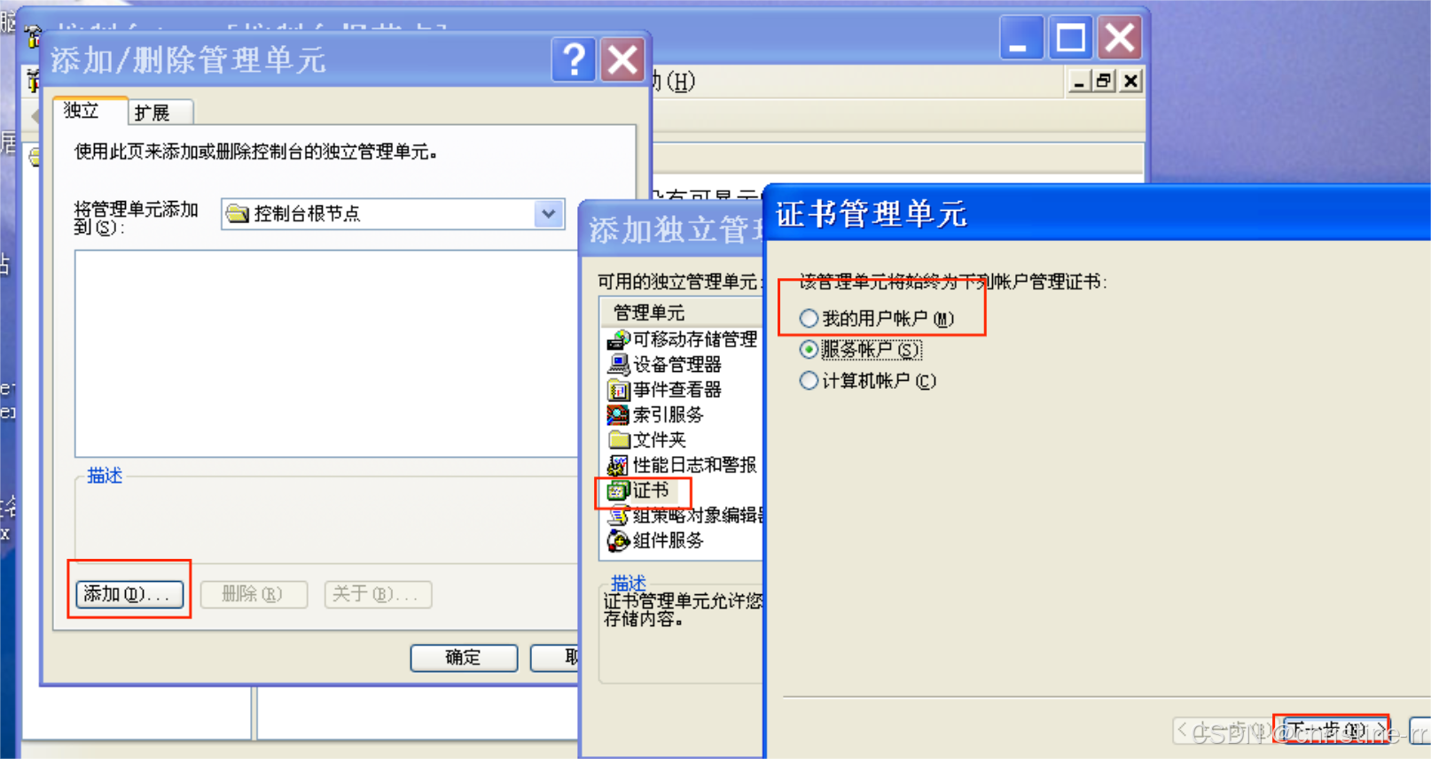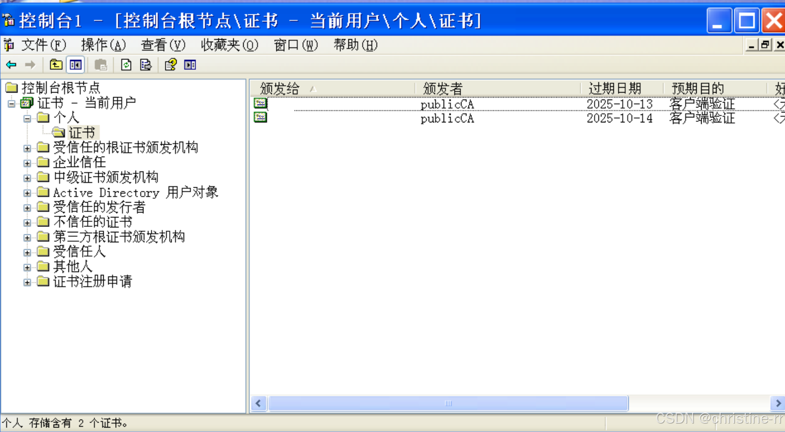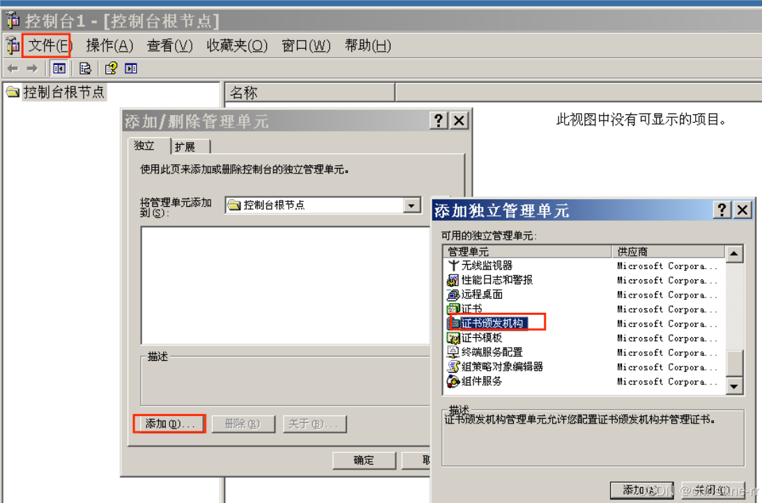 Win+R输入“mmc”进入控制台,点击“文件”添加管理单元,“添加/删除管理单元”——“添加”——勾选“证书颁发机构”