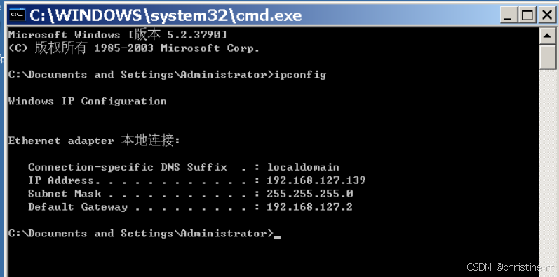 打开Windows server2003,win+R 输入cmd进入终端,输入ipconfig查看当前的IP地址:192.168.127.139和子网掩码:255.255.255.0