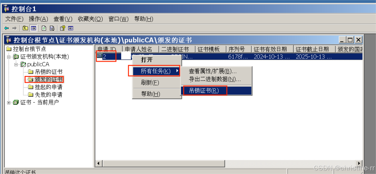 在Windows Server2003的根CA服务器上win+R打开“mmc”控制台右击“颁发的证书”吊销如图