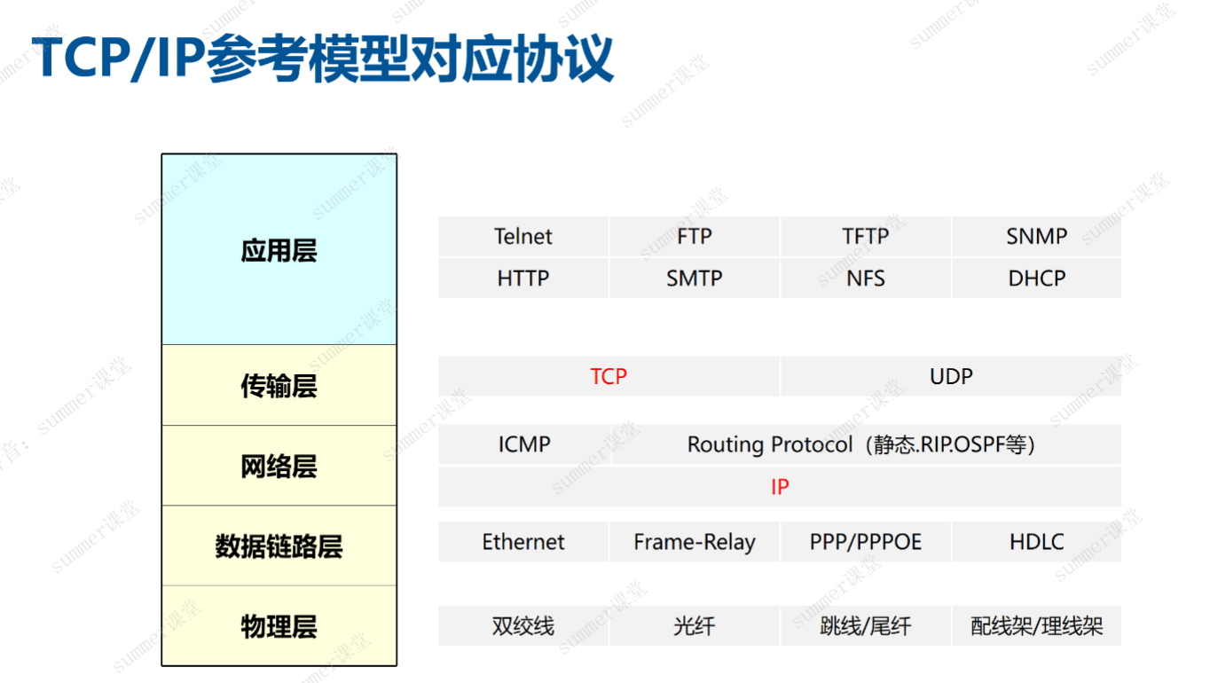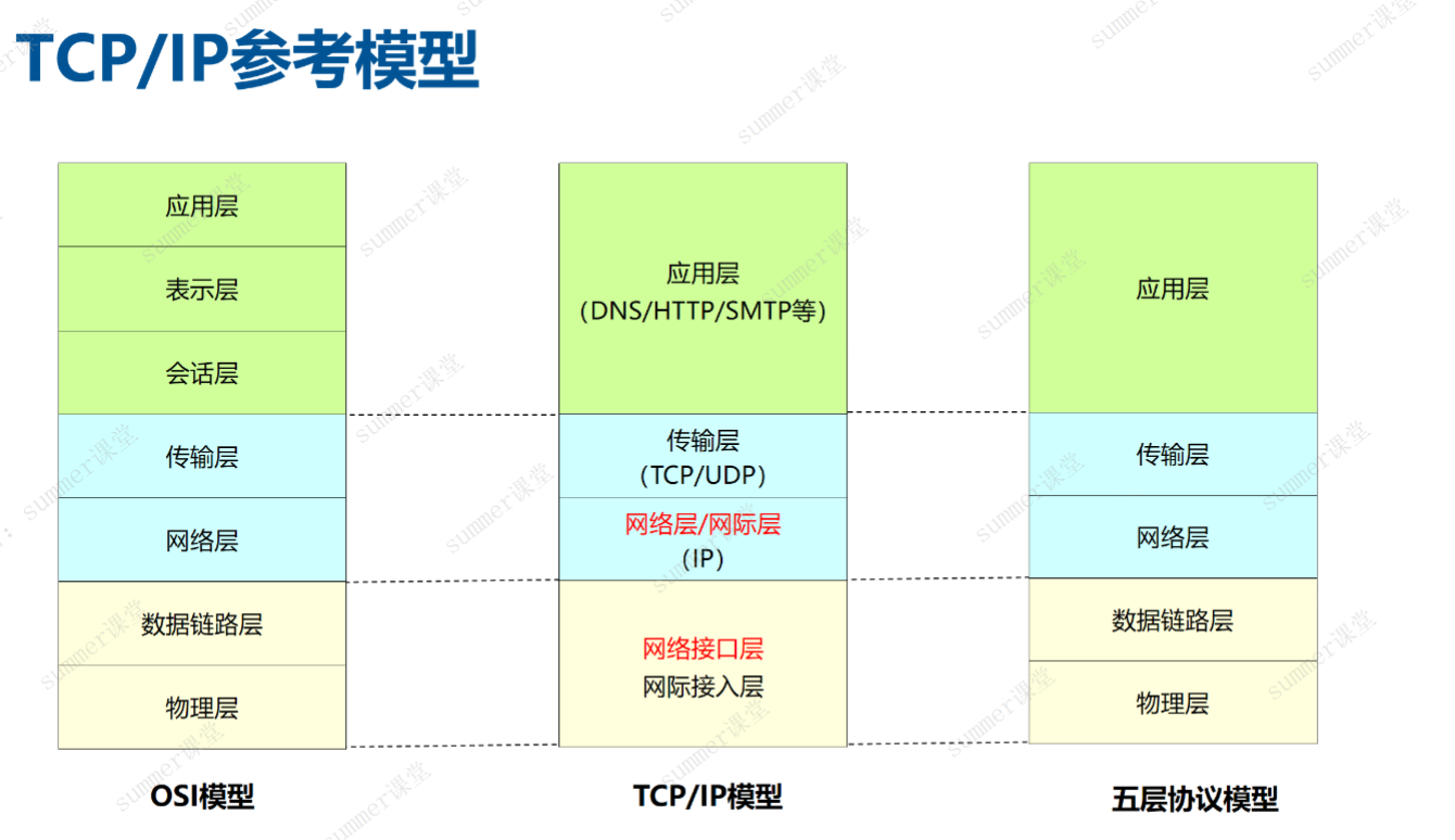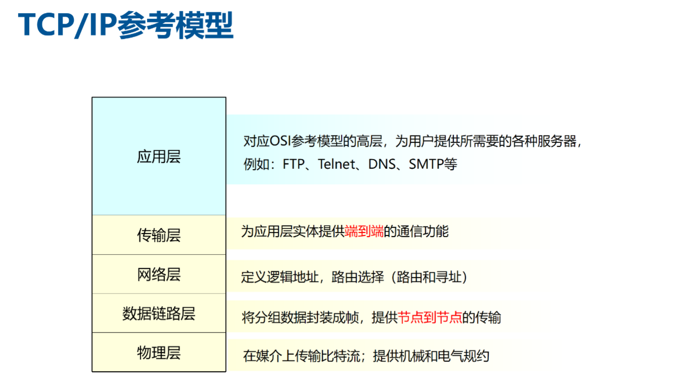 TCP/IP 参考模型是互联网采用的网络体系结构模型,它由四个层次组成,从下到上分别是: