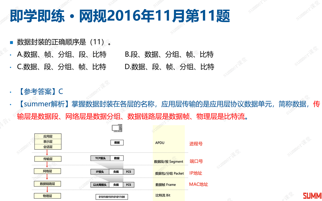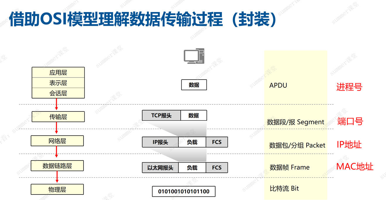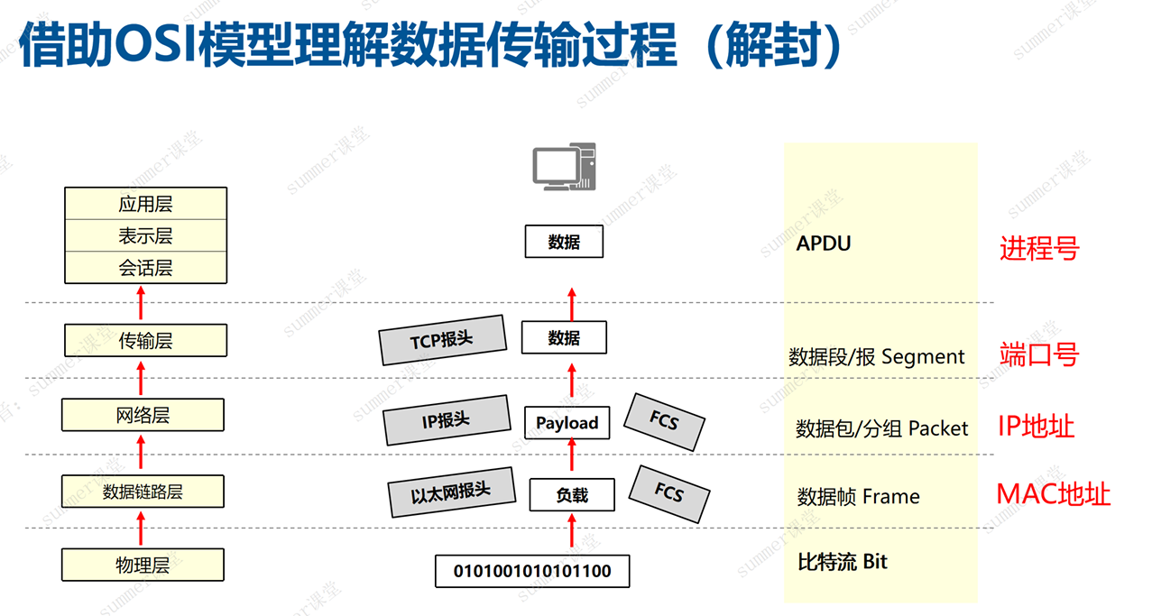 解封过程是封装的逆过程,数据从物理层到应用层,每一层会去掉对应层添加的头部(或尾部)信息,将数据还原为上一层的格式。