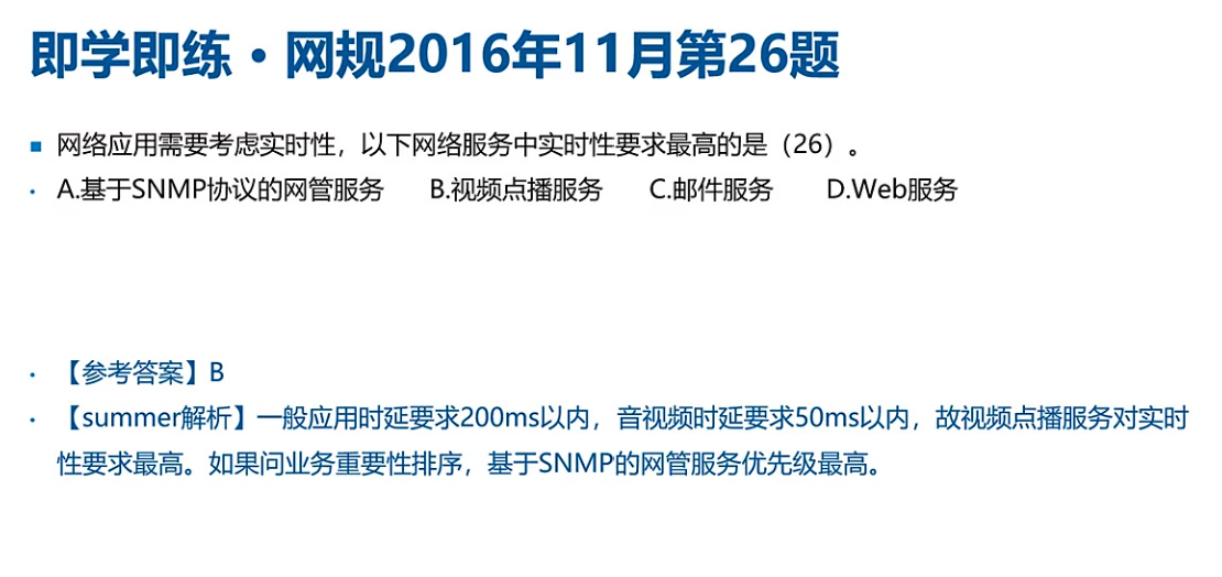 网络应用与实时性 | 网络应用实时性要求,如音视频业务延迟需控制在50毫秒以内 | 实时性要求与具体应用 | 🌟🌟 |
