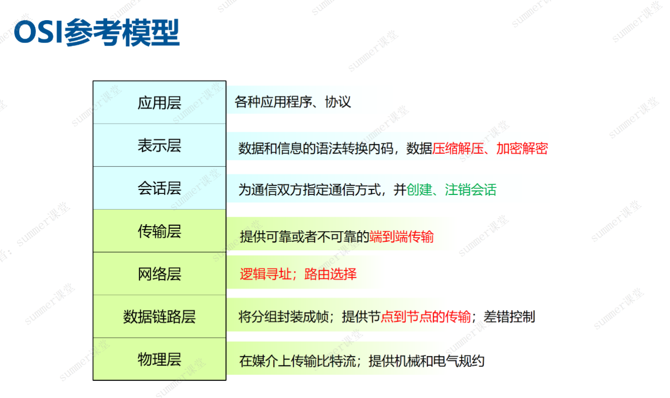 OSI模型将网络通信的功能划分为七个层次,从下到上依次为: