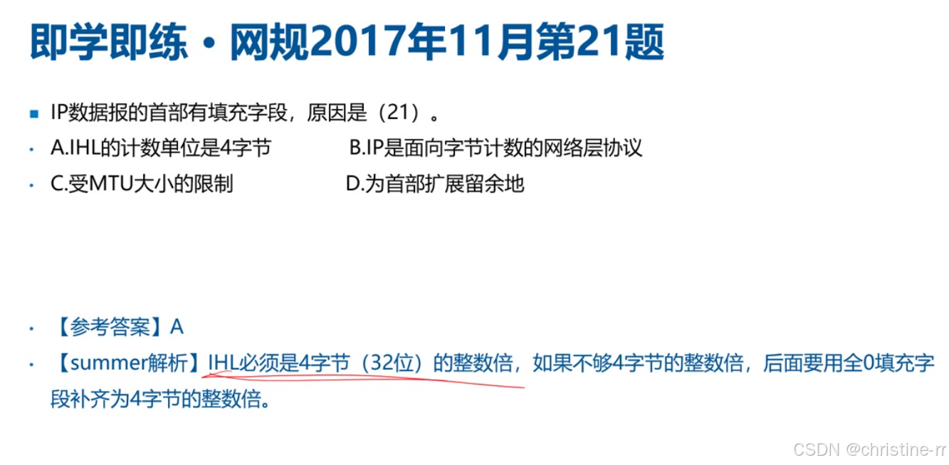 解析: IP报酬首部有填充字段的原因是IHL(首部长度)必须是4字节(32位)的整数倍。如果不够,需用全0填充字段补齐。