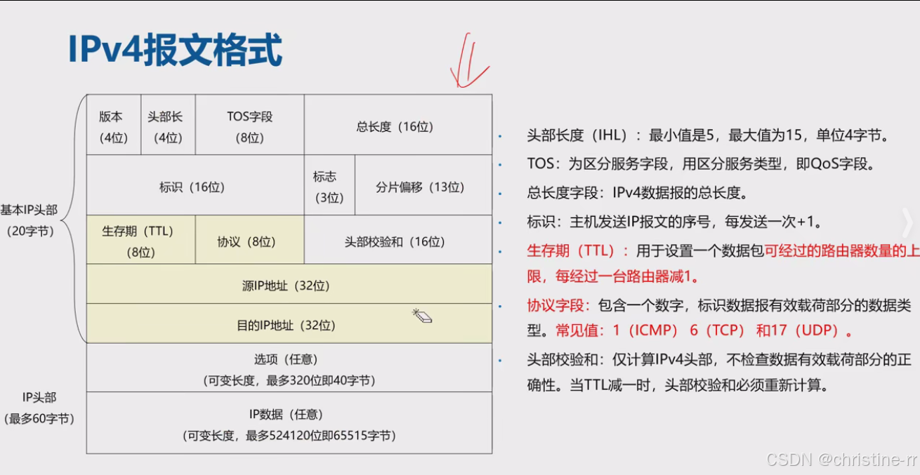 IPV4报文格式 | 包含版本号、头部长、TOS字段、总长度、标识、标志位、TTL、协议号、校验和等字段 | 版本号固定值(IPv4: 0100→4,IPv6: 0110→6) | ⭐⭐ |