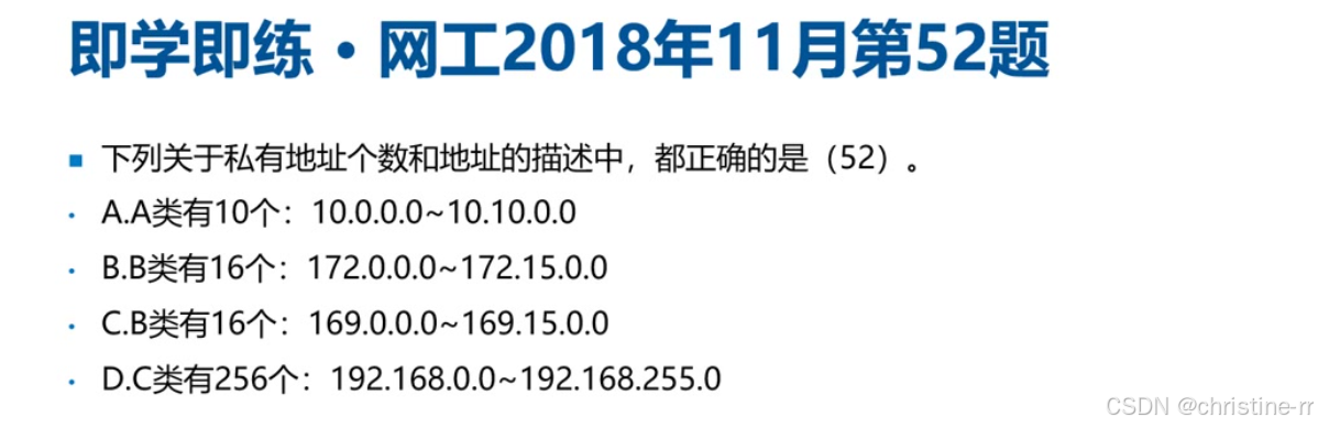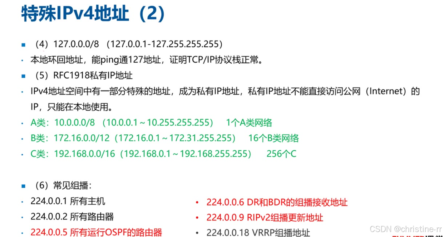 私有地址(RFC1918) | - A类:10.0.0.0/8 - B类:172.16.0.0/12(16个B类网段聚合) - C类:192.168.0.0/16(256个C类网段聚合) | B类私有地址范围(172.16-172.31)易错 聚合后掩码(B类/12、C类/16) | ⭐⭐⭐⭐ |