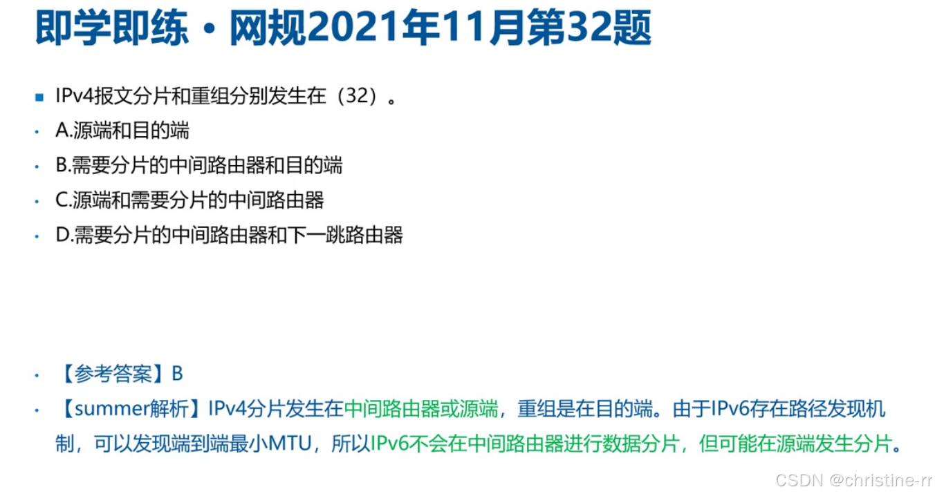 IPV4 vs IPV6 | IPV4:中间网络可分片; IPV6:通过MTU发现避免分片 | IPV6分片仅发生在源端 | ★★★★☆ |