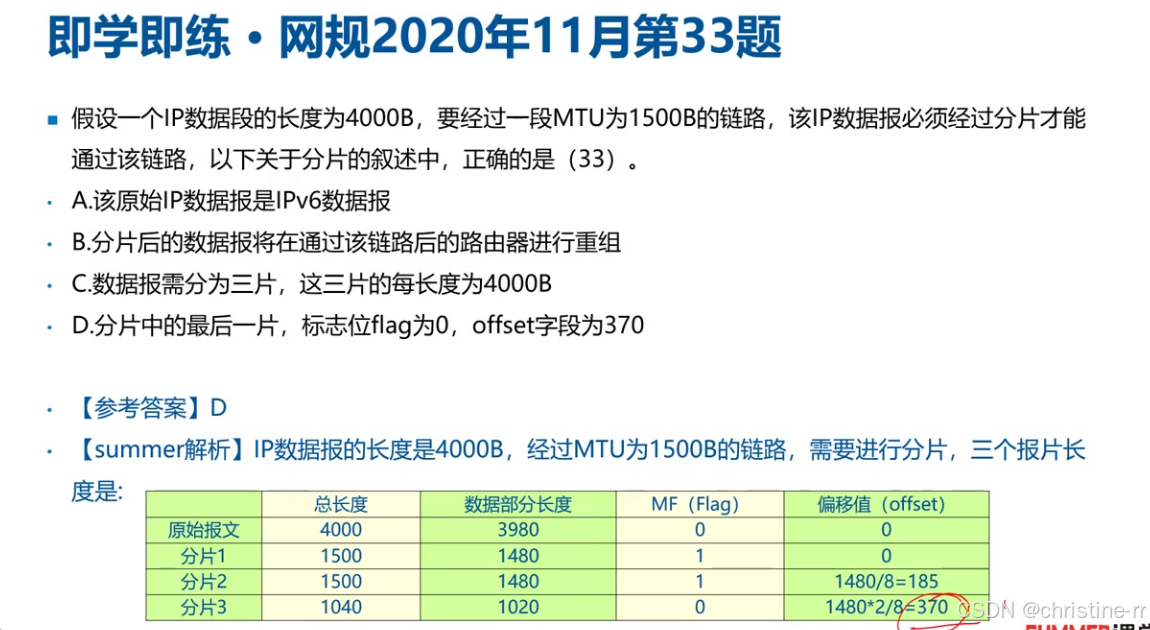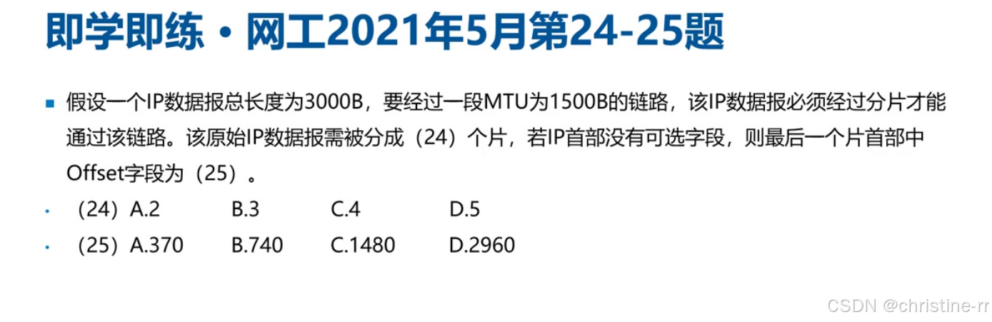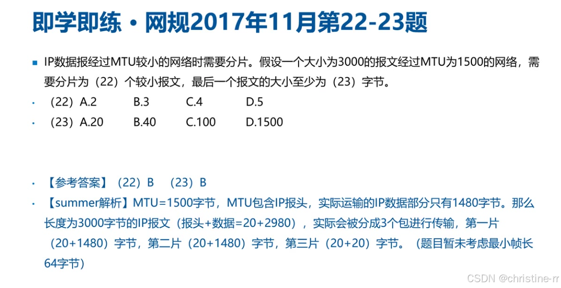 隐含条件:标准IP头部长度20字节,MTU1500字节 计算步骤: