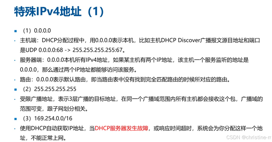 特殊IPv4地址 | - 0.0.0.0:DHCP初始请求源地址/服务器监听所有本地IP - 255.255.255.255:广播地址 - 169.254.x.x:DHCP失败后自动分配地址 - 127.x.x.x:环回地址(测试协议栈) | 0.0.0.0在DHCP Discovery中的用途 169.254.x.x的通信限制(仅局域网) | ⭐⭐⭐ |