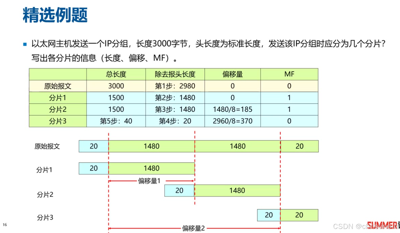 分片数量计算:当IP数据报总长度3000B经过MTU为1500B的链路时,需分成3片。第一片数据部分1480B(总长1500B含20B首部),第二片相同,第三片剩余20B数据(总长40B)。