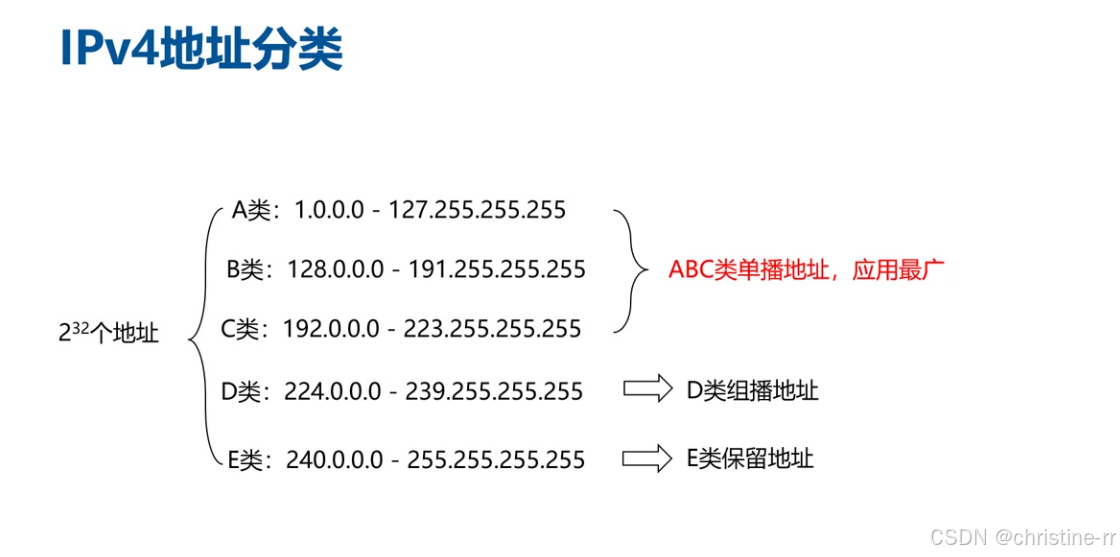基本结构:IPv4地址为32位二进制数,分为A、B、C、D、E五大类 主要分类: