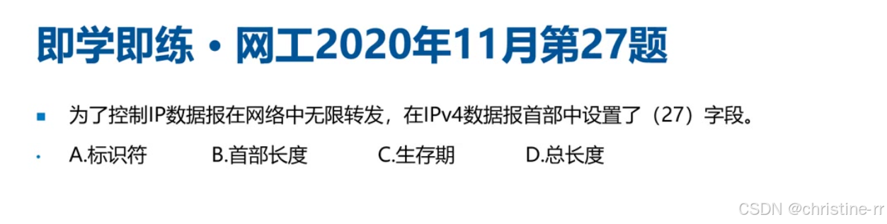 高频考题 | 头部长单位/范围、TTL作用、总长度最大值、填充字段原因 | 易错点:头部长单位非1字节而是4字节 | ⭐⭐⭐⭐ |