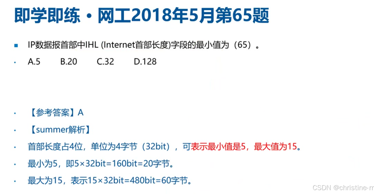 解析: IPv4首部的最大值为60字节,原因是IHL字段长度为4比特,最大能表示16个数(0-15),但单位取4字节,因此实际使用5-15这些数值,对应20-60字节。