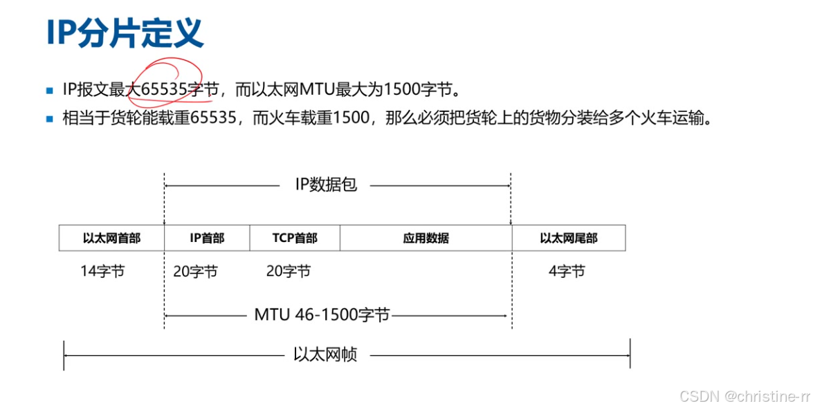 传输限制:IP报文最大长度65535字节,以太网MTU(最大传输单元)为1500字节 运输类比:相当于货轮(65535载重)需将货物分装给多个火车(1500载重)运输 帧结构:以太网帧包含首部14字节 + IP首部20字节 + TCP首部20字节+应用数据+尾部4字节,MTU范围46−1500字节