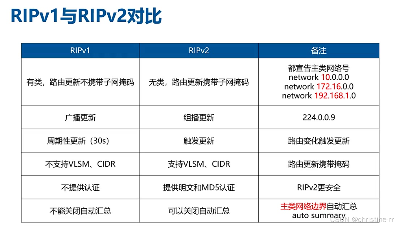 RIPv1和RIPv2的其他特性 | RIPv1不支持变长子网掩码和无类路由,RIPv2支持; RIPv1不提供认证,RIPv2支持明文和MD5认证; RIPv1不能关闭自动汇总,RIPv2可以 | 认证功能、自动汇总等特性的对比 | 🌟🌟🌟🌟 |