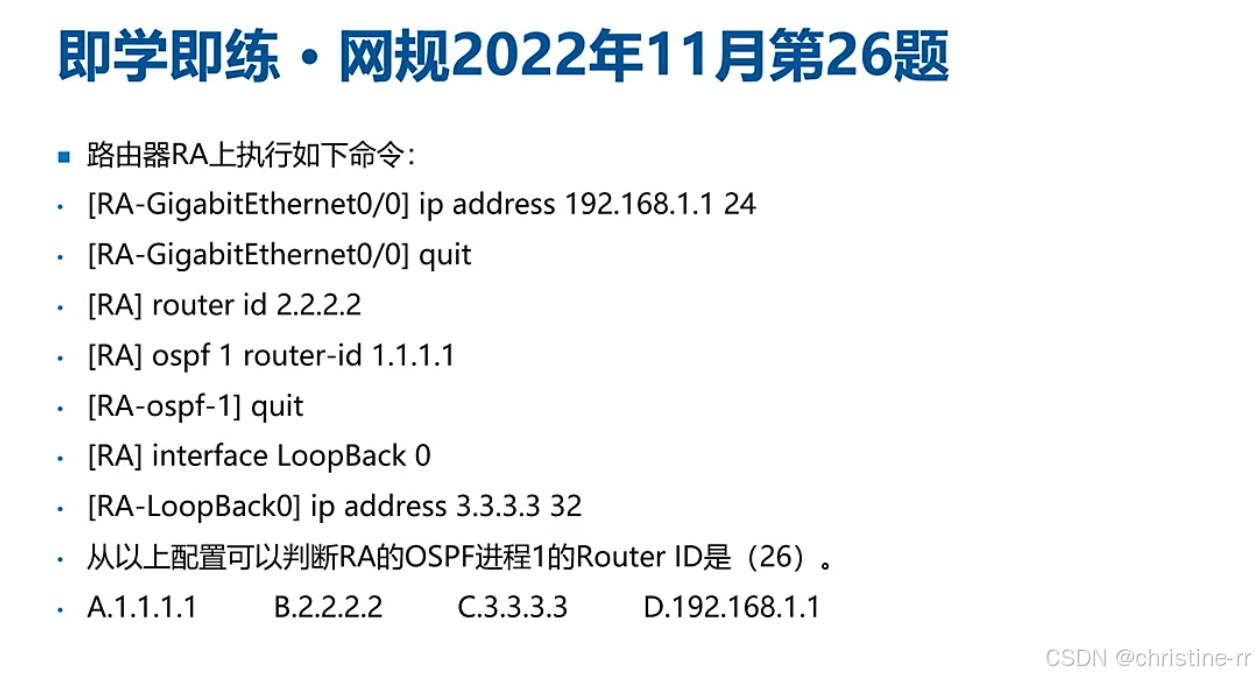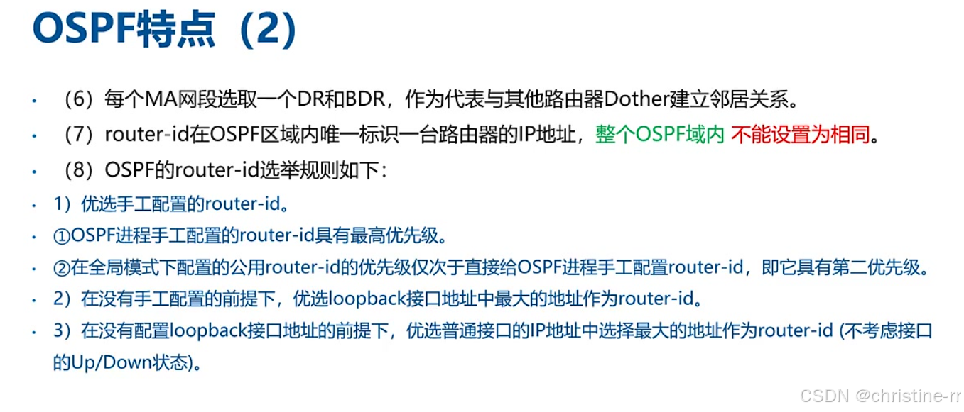 6.每个MA网段选取一个DR和BDR,作为代表与其他路由器Dother建立邻居关系。 7.router-id在整个OSPF区域内唯一标识一台路由器的IP地址,整个OSPF域内不能设置为相同。 8.OSPF的router-id选举规则如下: