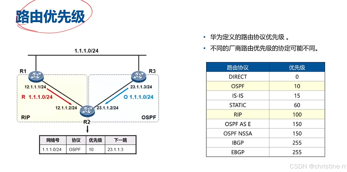 优先级定义: 不同路由协议具有不同的优先级,例如OSPF的优先级为10,RIP的优先级为100,优先级越小越优先,因此OSPF进入路由表。 路由协议优先级DIRECT0OSPF10IS-IS15STATIC60RIP100OSPF AS E150OSPF NSSA150IBGP255EBGP255