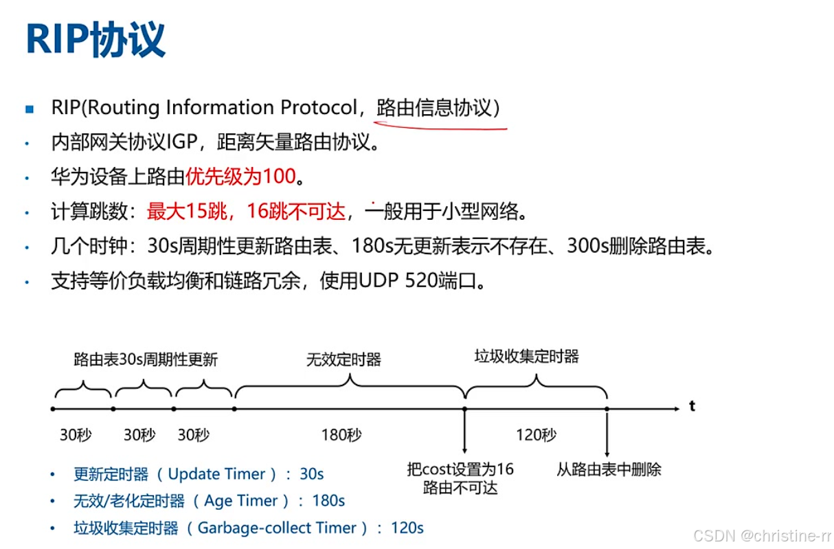 定义: RIP(Routing Information Protocol,路由信息协议)是一种内部网关协议IGP,属于距离矢量路由协议。 优先级: 在华为设备上,RIP的路由优先级为100。 跳数计算: RIP通过计算跳数来确定路由开销,最大支持15跳,16跳表示网络不可达,因此一般用于小型网络。 几个时钟/定时器: