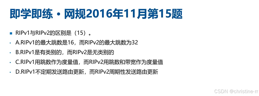RIPv1和RIPv2的比较 | RIPv1有类,不携带子网掩码;RIPv2无类,携带子网掩码 | 有类和无类的区别,子网掩码的携带 | 🌟🌟🌟🌟 |