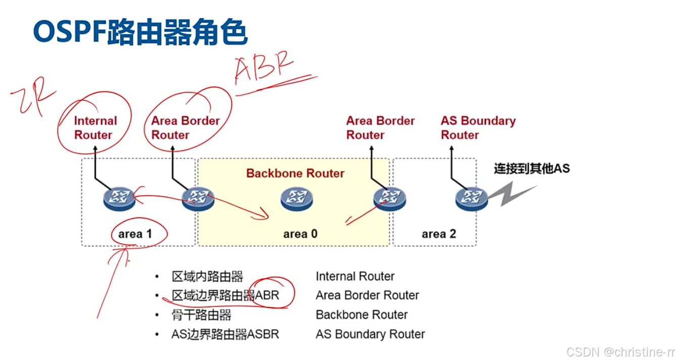 内部路由器(IR): 所有接口均在同一区域的路由器,如仅属于Area 1或Area 0的路由器。区域 区域边界路由器(ABR): 连接多个区域的路由器,如同时有接口在Area 0和Area 1的设备,具有路由汇总功能。 骨干路由器(BR): 至少有一个接口在Area 0的路由器,角色可与ABR重叠(如图中R2/R3既是ABR又是BR)。 AS边界路由器(ASBR): 连接其他AS或执行路由引入的路由器,如连接RIP域或配置import route的设备。