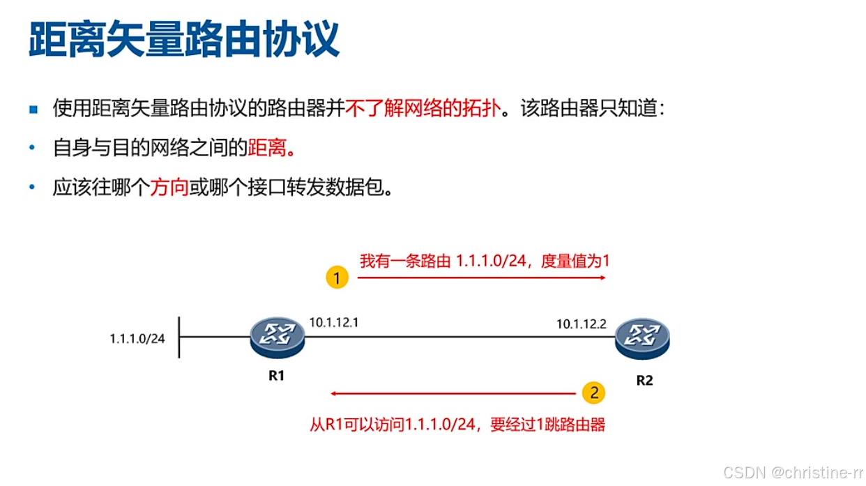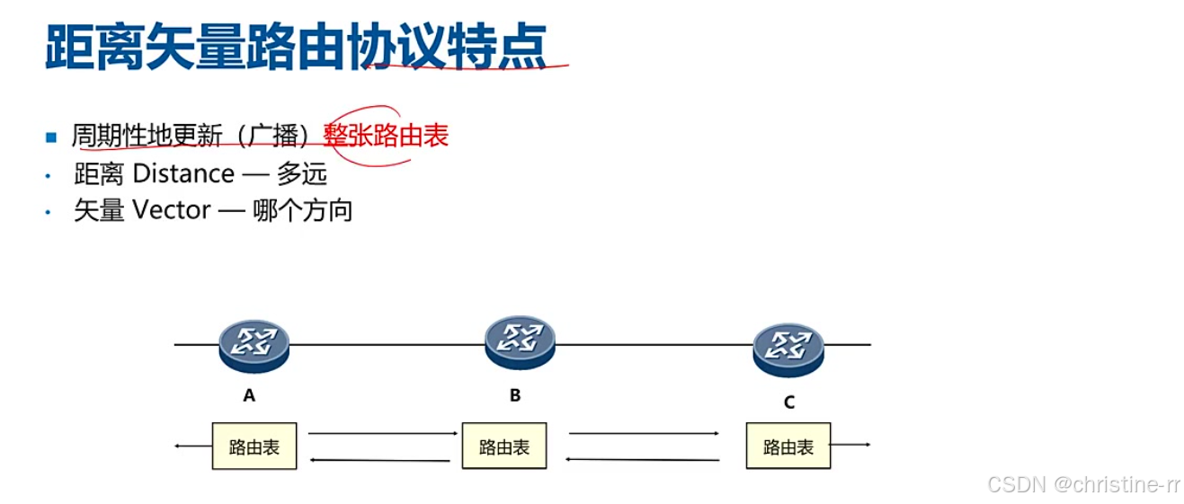 特点: 使用距离矢量/向量路由协议的路由器不了解网络拓扑,只知道自身与目的网络之间的距离以及转发数据包的方向。