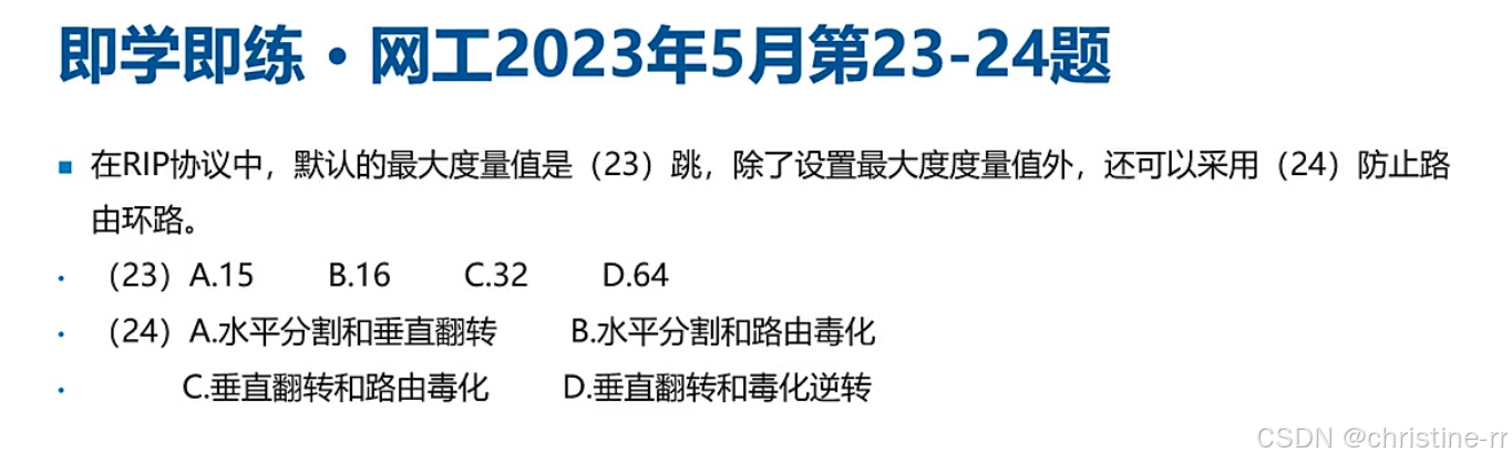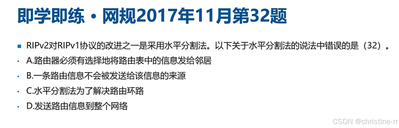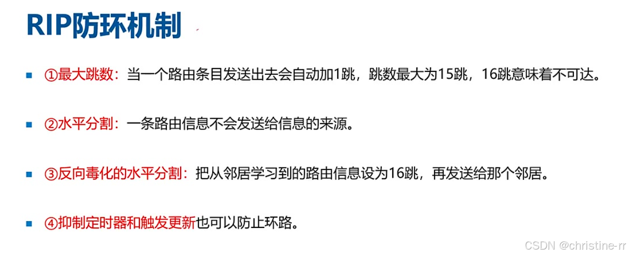 RIP的防环机制 | 最大跳数、水平分割、反向毒化的水平分割 | 防环机制的具体方法 | 🌟🌟🌟 |