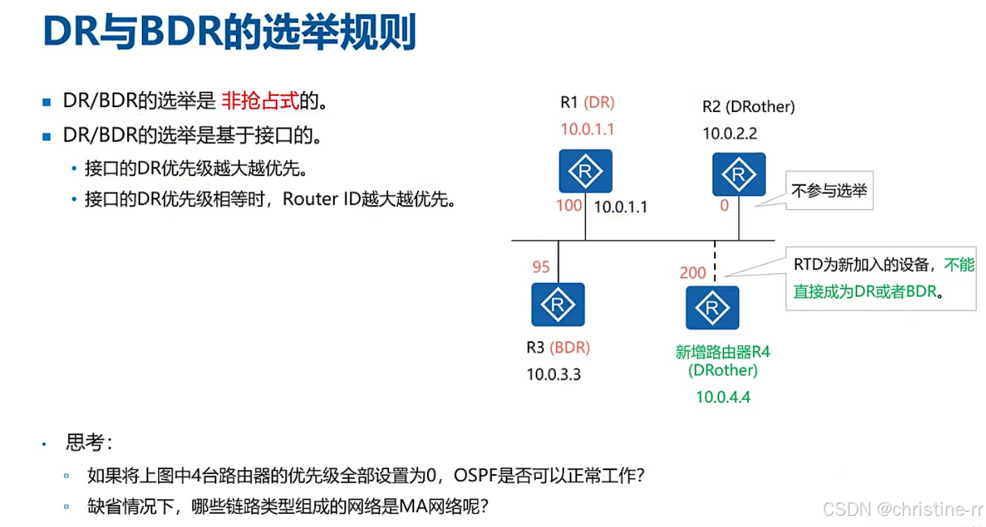 非抢占机制:选举结果确定后,即使新加入设备优先级更高(如R4优先级200),也不会取代现有DR/BDR,必须等待DR故障后由BDR接替 继承顺序:当DR故障时,BDR自动晋升为DR,然后重新选举新的BDR,形成"论资排辈"的更新机制 2)优先级为零的特殊情况 特殊含义:优先级0表示该路由器不参与DR/BDR选举(如示例中R3) 取值范围:有效优先级范围为1−255,默认值为1 选举排除:优先级为零的设备永远作为DRother存在 3)优先级相等时的选举规则 次选条件:当优先级相同时,比较Router ID大小,数值更大的路由器胜出 比较规则:Router ID比较采用数值比较原则(如10.0.1.1 > 10.0.0.1) 4)新增路由器对DR/BDR的影响 初始网络:示例中R1(优先级100)为DR,R3(优先级95)为BDR,R2(优先级0)为DRother 新增设备:R4加入时优先级200虽最高,但因非抢占特性仍保持原有DR/BDR配置 5)优先级全部为零时OSPF的工作状态 完全失效:当所有路由器优先级均为0时,无法选举DR导致OSPF邻居关系不能进入FULL状态 部分可行:若至少一台设备优先级非零(如四台中三台为0),仍可正常选举DR并建立邻居关系 6)MA网络的典型类型 主要类型:以太网(Ethernet)是当前最典型的MA(多路访问)网络 历史类型:FDDI、令牌环等传统MA网络已淘汰,现代网络主要关注以太网环境
