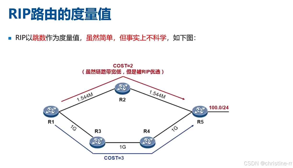 度量标准: RIP以跳数作为度量值,虽然简单但有时不科学。例如,可能选择带宽较低的链路而非带宽较高的链路。