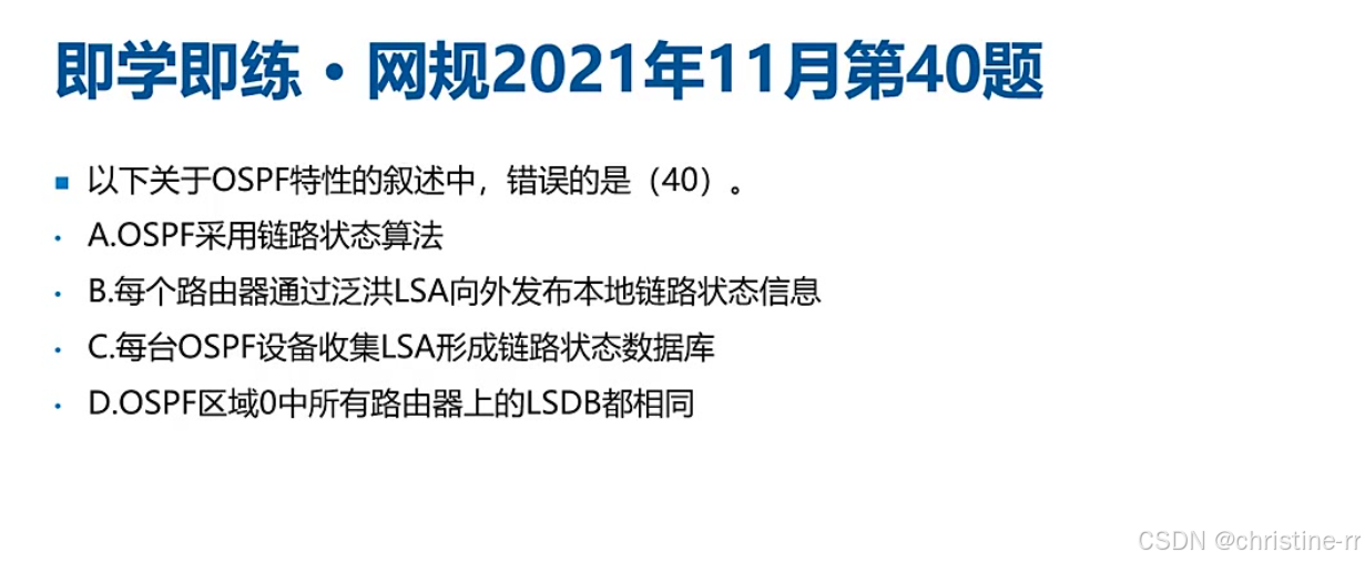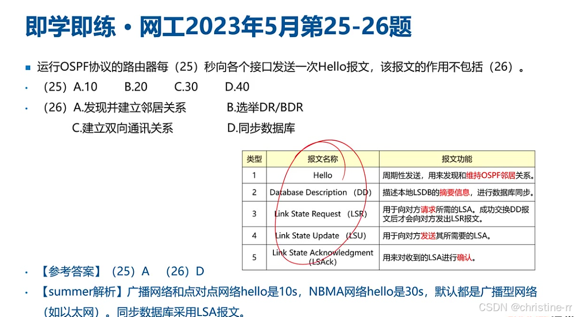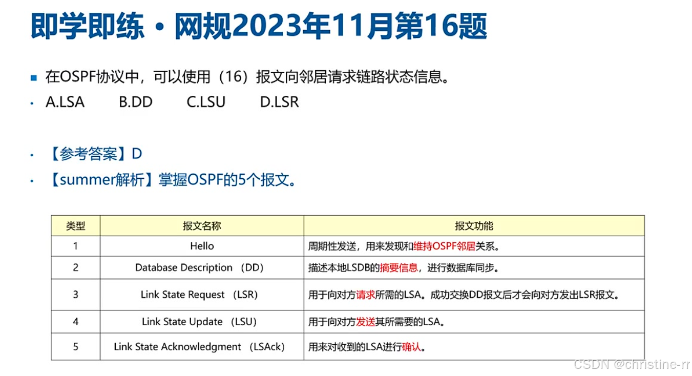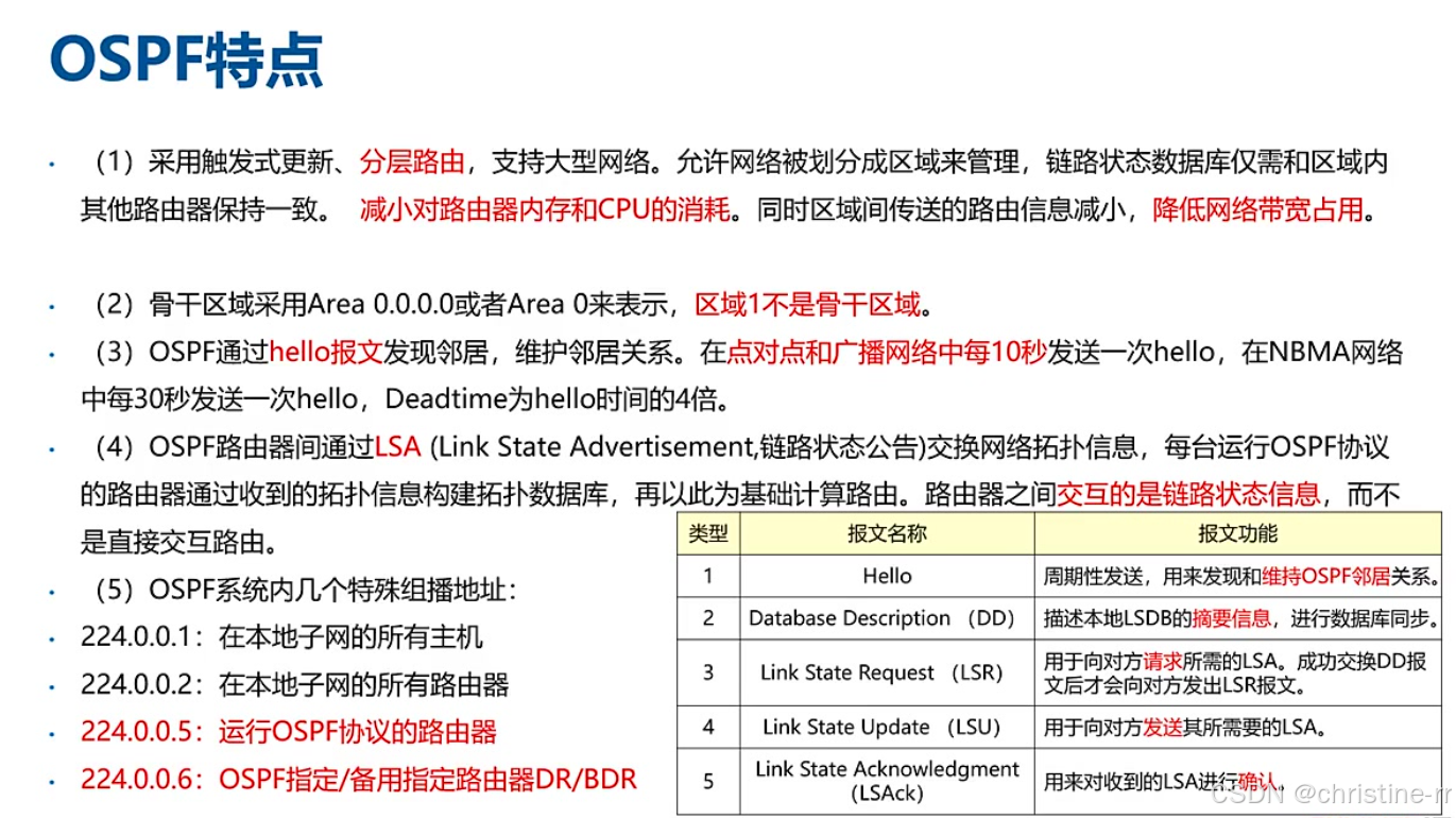 报文类型 | Hello(10s/30s)、DD(目录)、LSR(请求)、LSU(更新)、LSAck(确认) | 功能区分:真正传递LSA的是LSU报文 | ★★★★ |