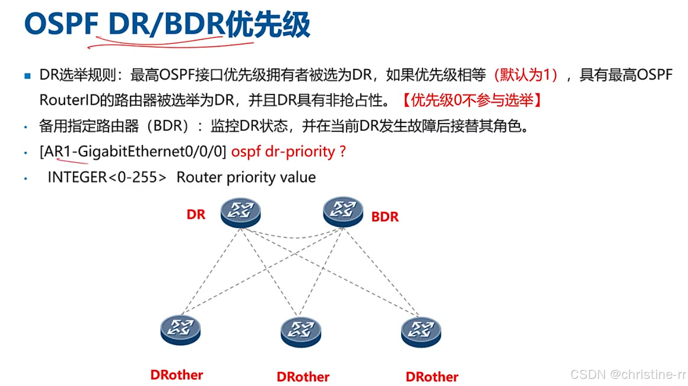 配置命令:在接口视图下使用ospf dr-priority命令设置 取值范围:0−255,其中0表示不参与选举,默认值为1 角色关系: