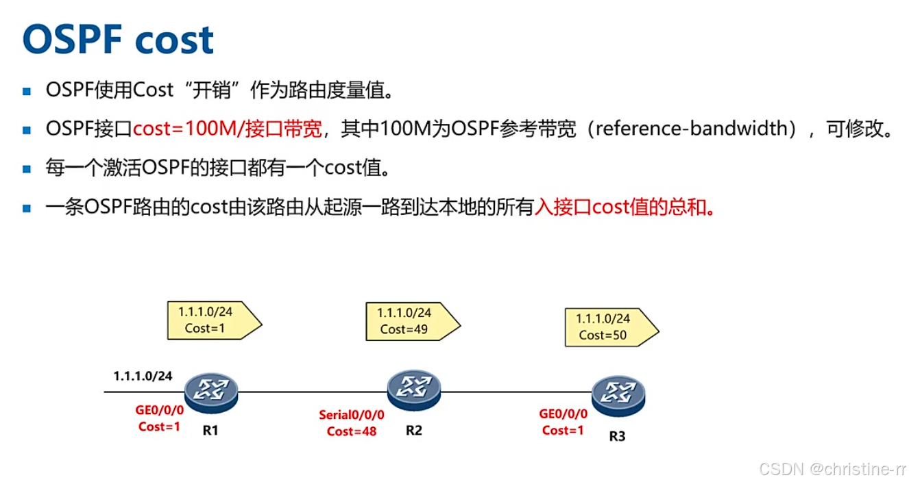 路由计算 | Cost=参考带宽/接口带宽(不足1取1),路径cost为入方向累加 | 千兆口cost=0.1但实际取1 | ★★★★ |