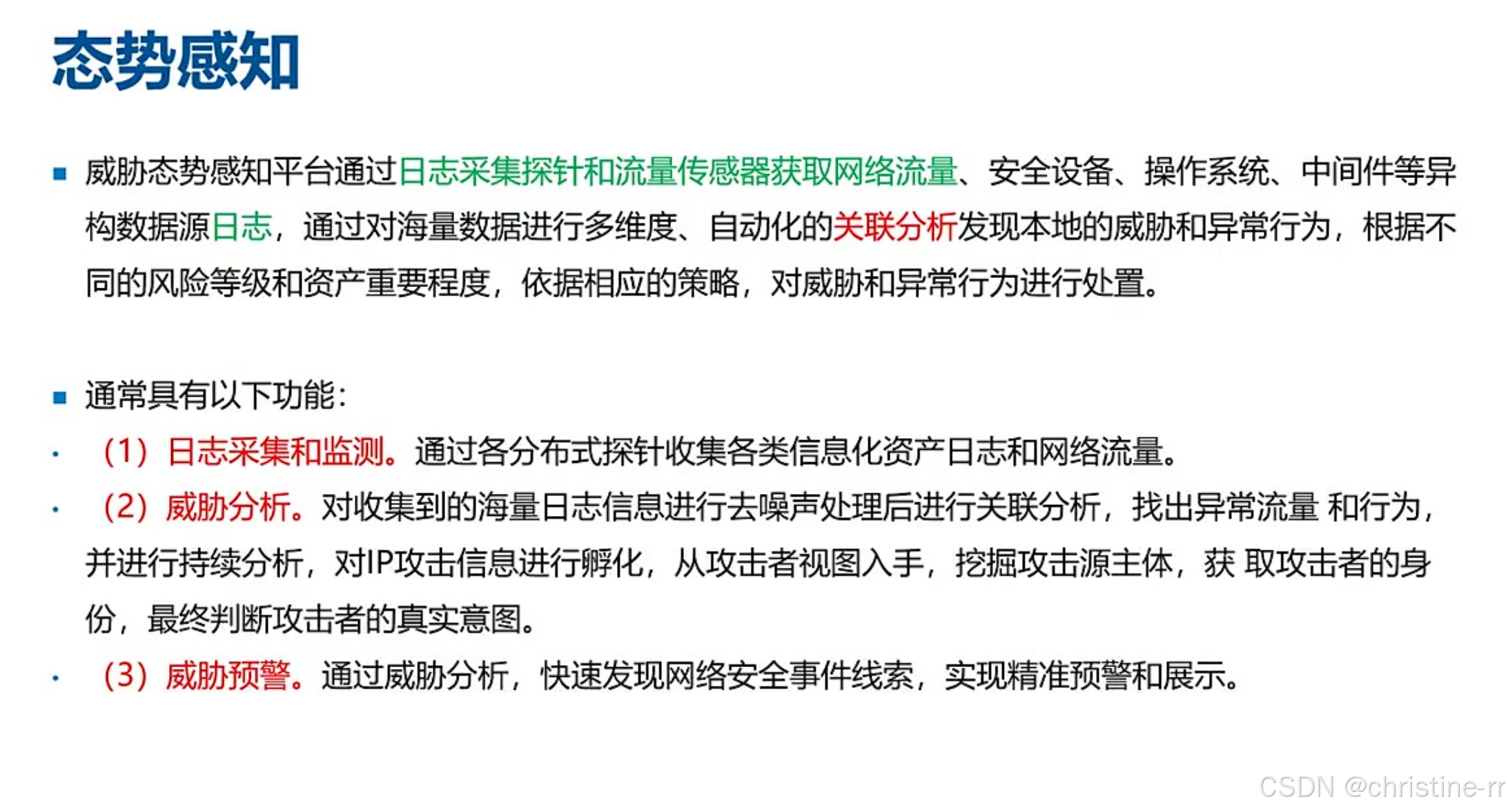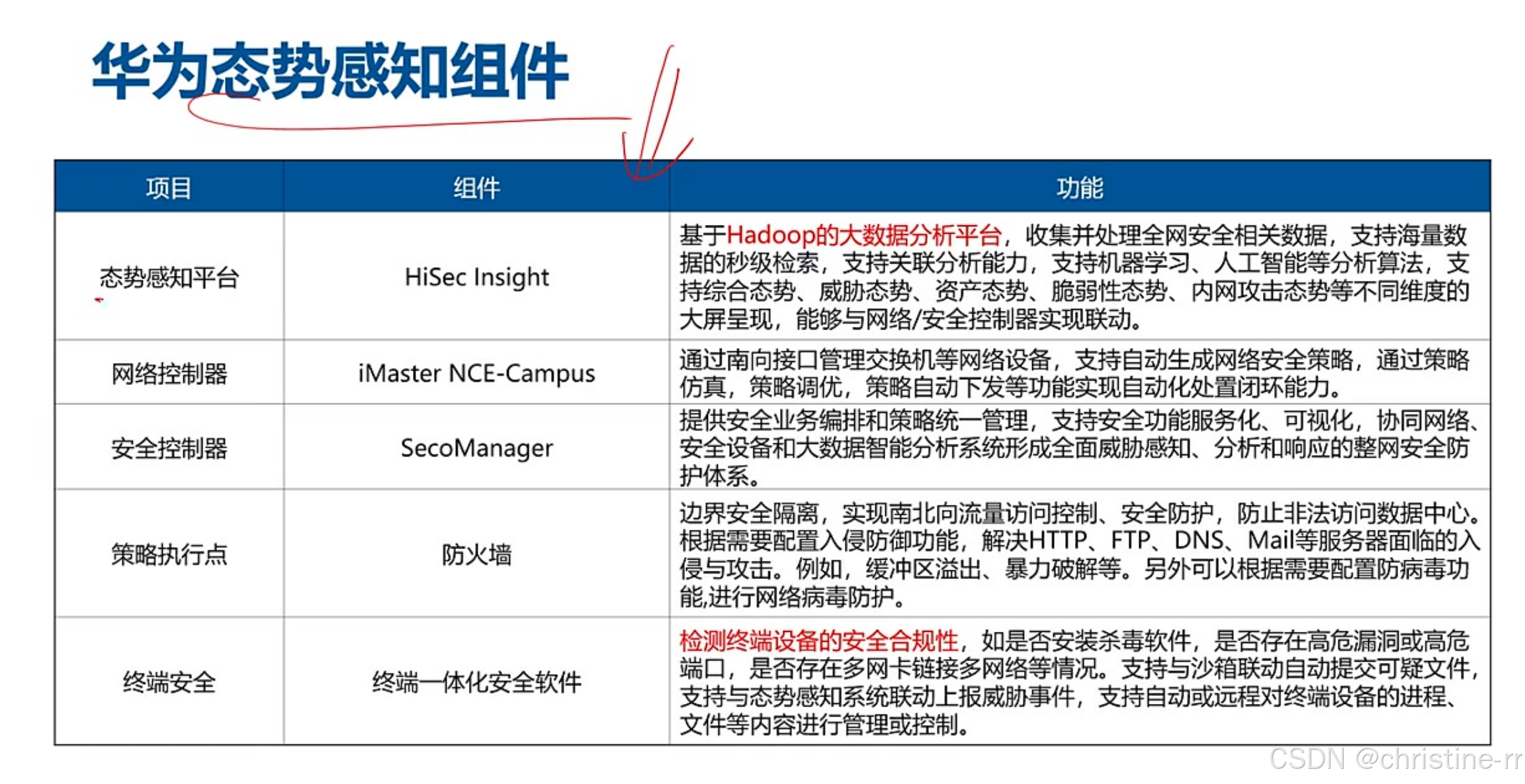 态势感知平台 | 大数据分析日志+流量,可视化展示威胁,支持联动响应(实际落地效果有限) | 核心组件: - 日志采集(防火墙/EDR); - 流量探针(硬件/华为内置); - 分析引擎(Hadoop) | ⭐⭐⭐⭐ |