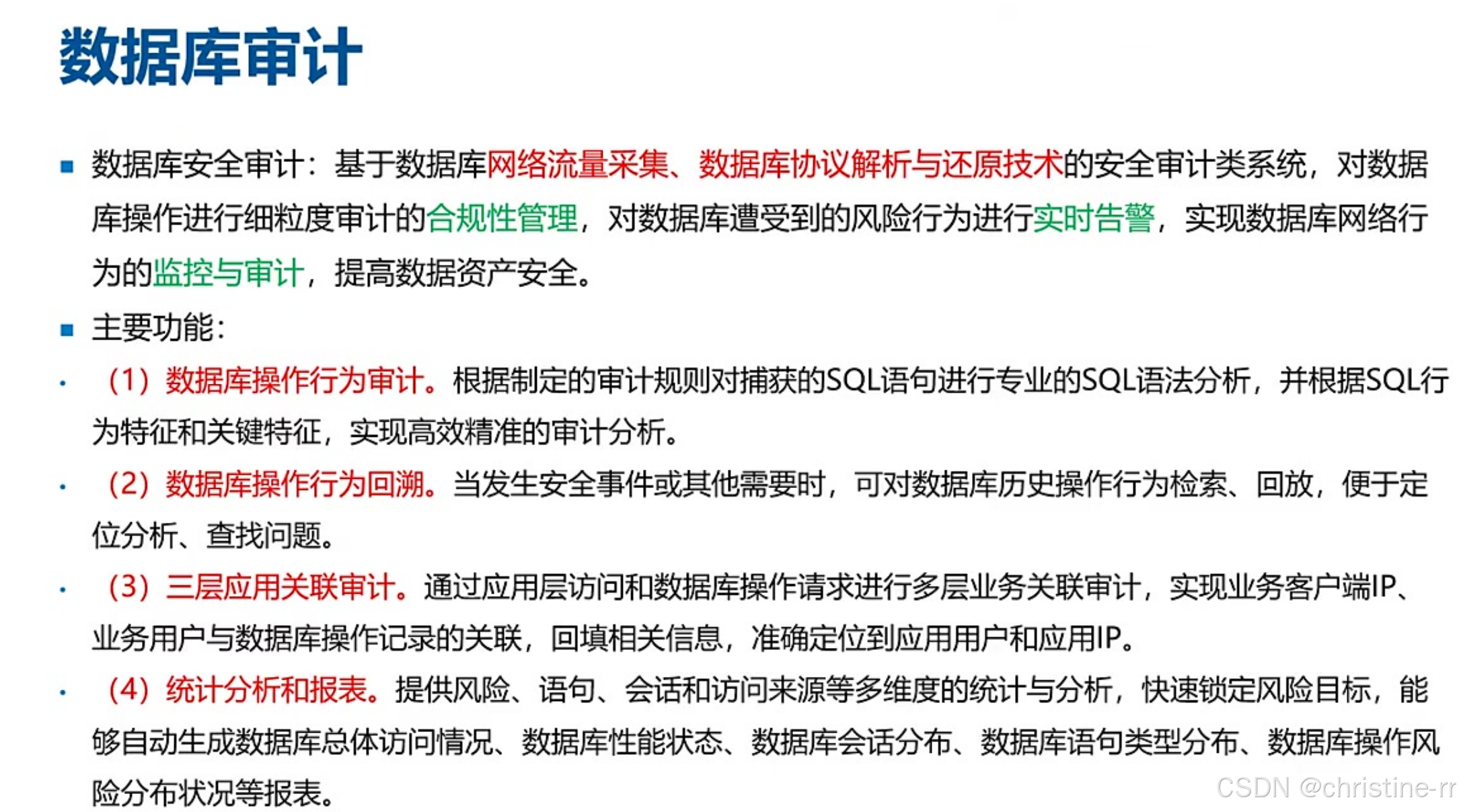数据库审计 | 监控数据库操作,支持行为回溯/关联审计(如医疗"统方"分析)/恶意输入过滤 | 部署方式: - 旁挂(主流)→仅审计; - 串行→可过滤(类似IPS) | ⭐⭐⭐ |