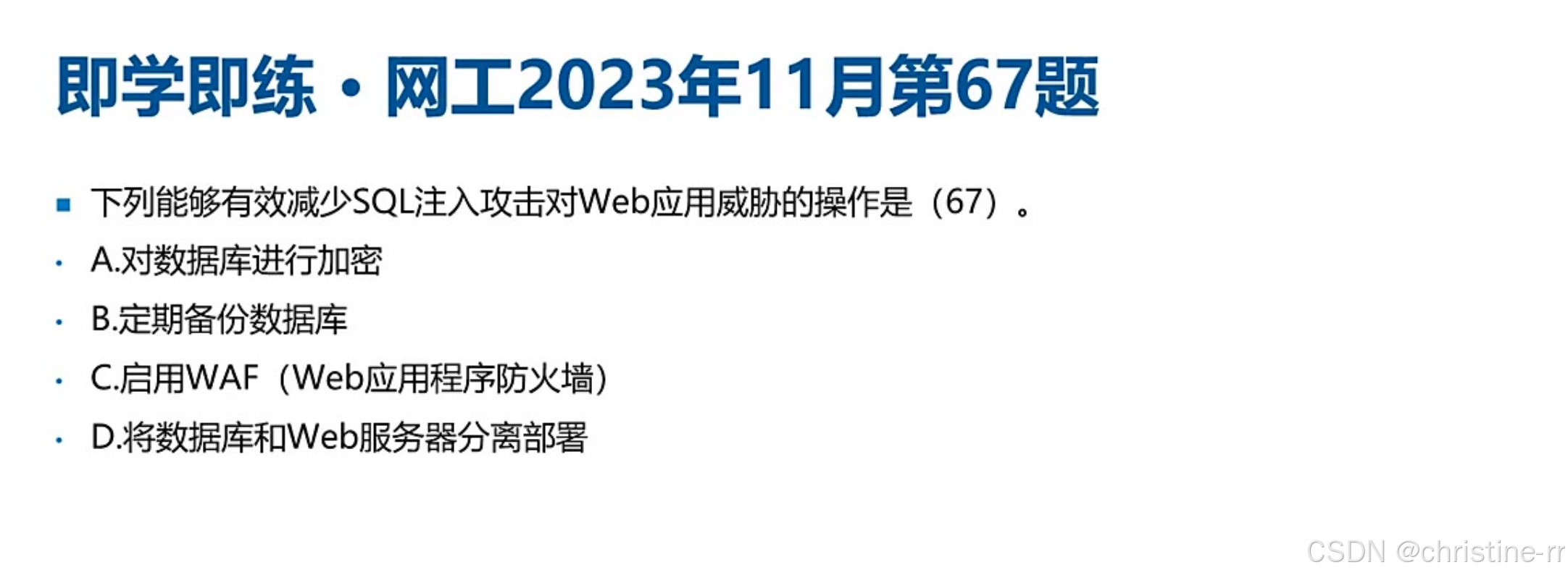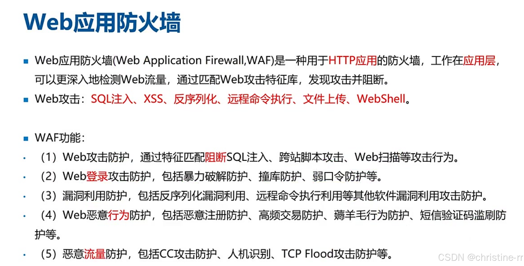 Web应用防火墙(WAF) | 工作在应用层,检测网页流量并匹配攻击特征库,阻断SQL注入/XSS/文件上传等攻击 | 简写易错:WAF非"wife"; 功能分类:Web攻击防护/登录防护/虚拟补丁/恶意流量防护 | ⭐⭐ |