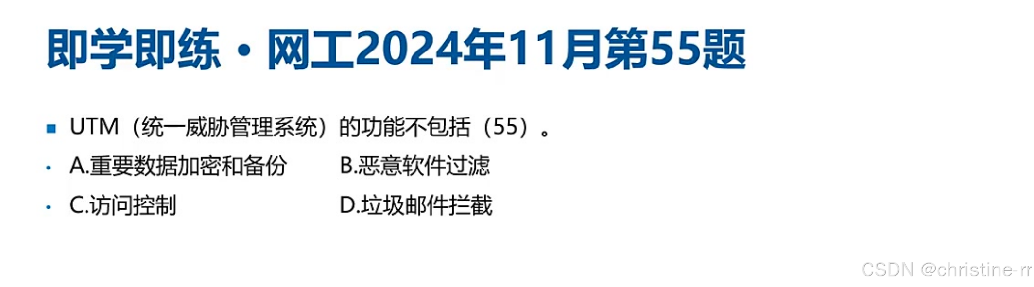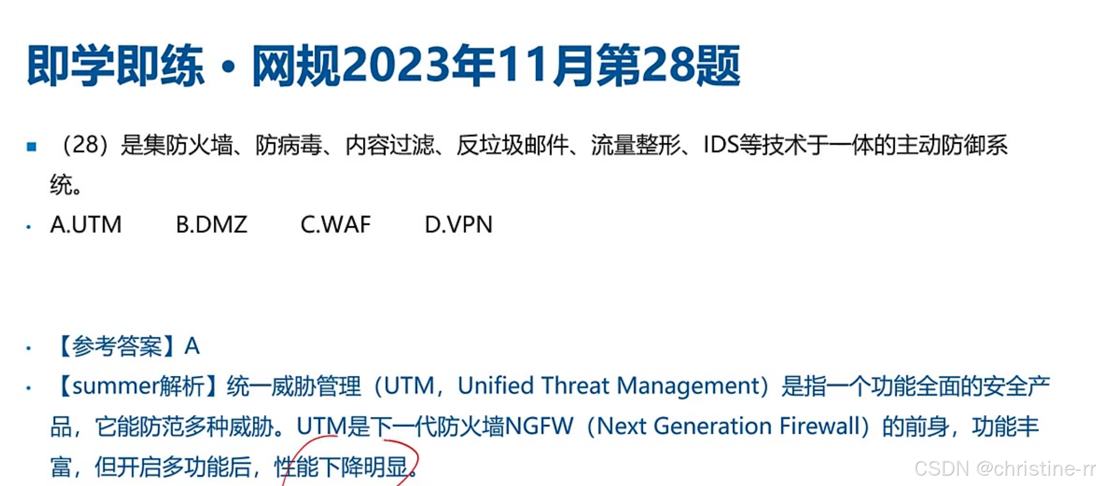 统一威胁管理(UTM) | 多功能集成设备(防火墙+IDS+防病毒等),性能损耗大(开多功能吞吐量骤降) | 对比NG防火墙: - UTM:多次拆包,效率低; - NG防火墙:一次拆包多次检测,性能更优 | ⭐⭐⭐ |