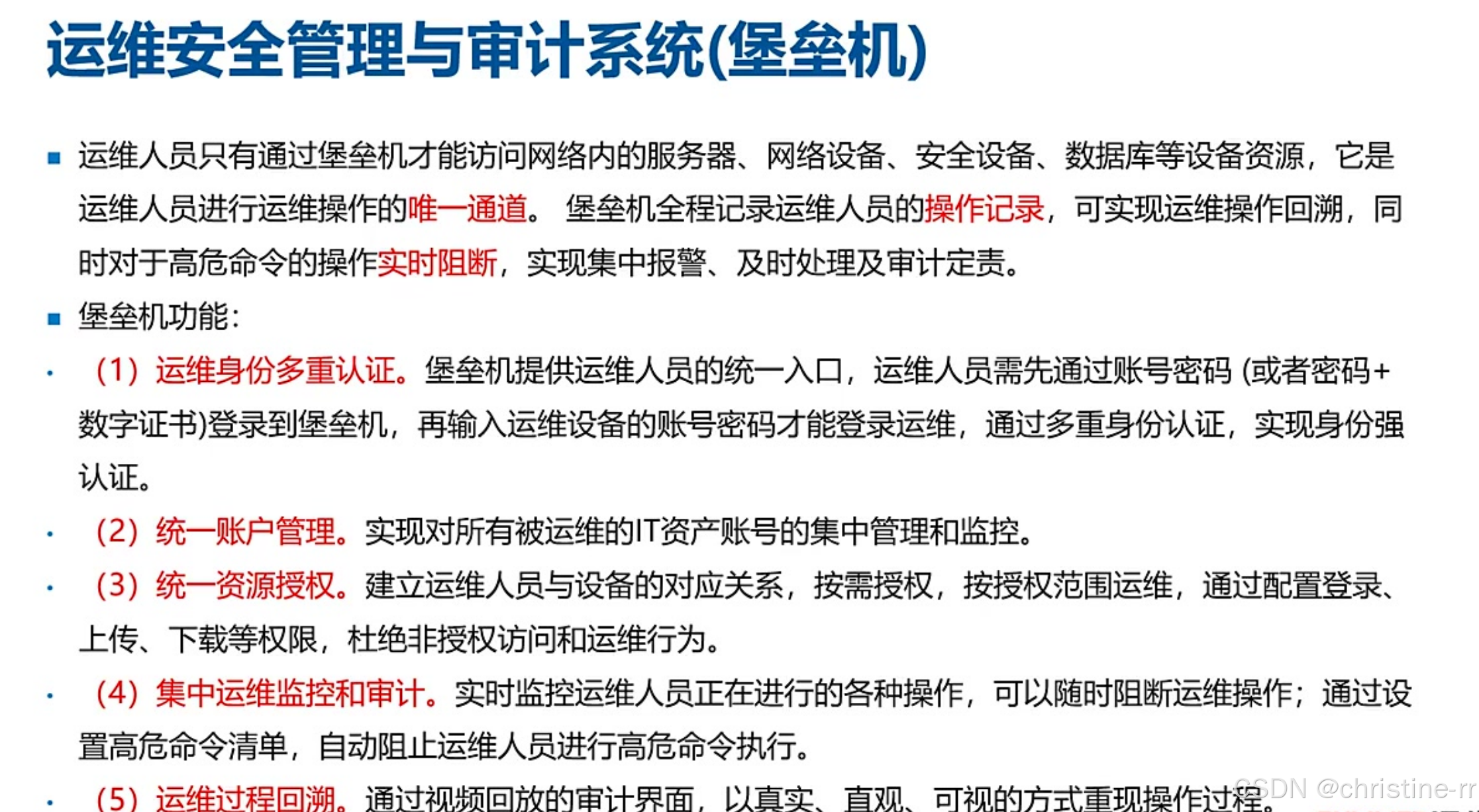 堡垒机 | 运维唯一入口,实现权限隔离+操作录屏审计(视频低帧率存储节省空间) | 现代特性:单点登录(非传统多重认证); 核心价值:防删库跑路/外包权限管控 | ⭐⭐⭐ |