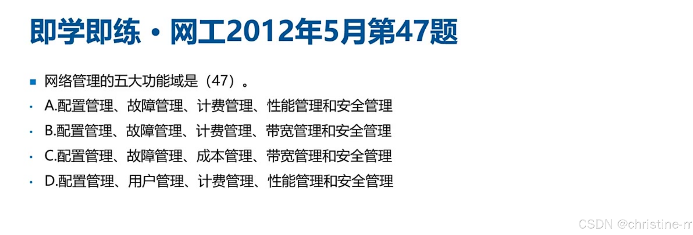 网络管理五大功能域 | 故障管理、配置管理、计费管理、性能管理、安全管理 | 助记词“安配能记账”(安:安全管理,配:配置管理,能:性能管理,计:计费管理,账:故障管理) | ⭐⭐ |