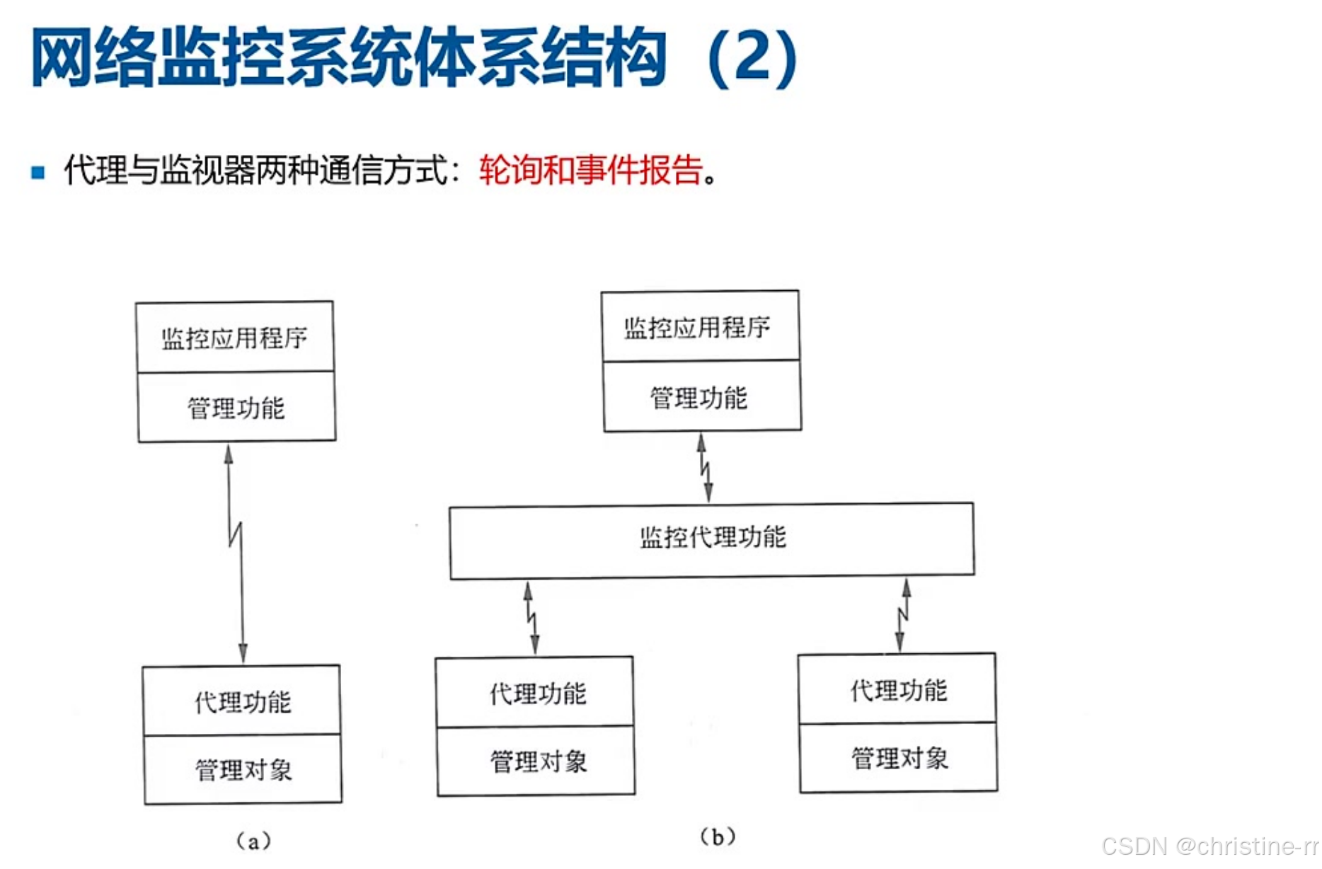 网络监控体系结构 | 客户端(管理对象+代理Agent)与网管服务器通信 | 两种通信方式:轮询(定期请求) vs 事件报告(异常触发) | ⭐⭐⭐ |