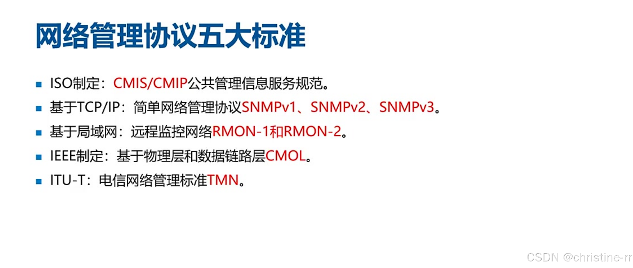网络管理协议标准 | ISO的CMIS/CMIP(OSI模型); IETF的SNMP(TCP/IP主流); RMON(局域网流量监控) | 协议对比:SNMP(设备级) vs RMON(流量级) | ⭐⭐⭐ |